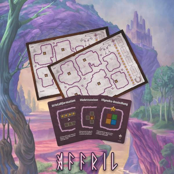 Affril: Als sich ein Riss öffnete und seltsame Kreaturen auf ihren fledermausartigen Pferden hindurchritten, wussten die Kartographen, dass sie nur eine Chance haben würden, diese Ebene zu kartieren. Sie sprangen durch den Riss und fanden sich auf einem Netzwerk von purpurfarbenen Steinbögen wieder, die aus einem riesigen, grauen Meer aufragten. Mit Waage und Kompass ausgerüstet beginnen die königlichen Kartographen die sicherlich größte Herausforderung ihrer Karriere.