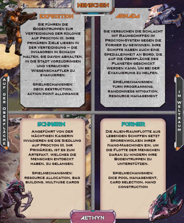Taverna Ludica Games (2021)2107 A.D.: Menschliche Kolonisten auf Procyon III haben ein uraltes außerirdisches Artefakt ausgegraben. Die Aethyn, eine außerirdische Fraktion, greifen die Verteidigungsanlagen der Siedlung an und versuchen, den uralten Terror zu stoppen, den die Menschen womöglich unwissentlich geweckt haben. Schon bald kommt es zu einer Schlacht im Orbit des Planeten, als die U.N. ihre Flotte schickt, um die Kolonie zu befreien, während Wissenschaftler daran arbeiten, die Kommunikation der Außerirdischen zu entschlüsseln und ihren neu entdeckten Feind zu verstehen ...