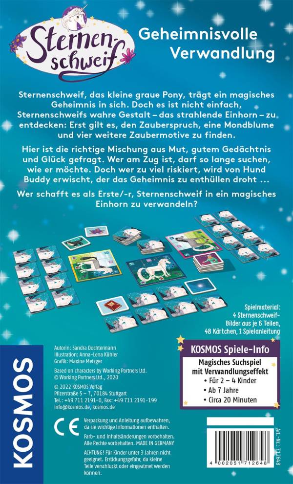 Kosmos (2021)Wer findet die magische Mondblume, den leuchtenden Silberstern und die geheime Lichtung? Nur wenn insgesamt sechs Bedingungen erfüllt werden, verwandelt sich das unauffällige graue Pony in das strahlende Einhorn Sternenschweif. Wie Laura aus der Bestseller Kinderbuch Reihe "Sternenschweif" versuchen Kinder ab 7 Jahren ihr Glück. Wurde eine Bedingung erfüllt, dann wird das entsprechende Teil des Puzzles umgedreht. Wem gelingt es, die sechs Kärtchen zu finden, die Sternenschweif verwandeln? Aber Achtung! Auf dem Weg zum Ziel warten einige Hindernisse. Ein bisschen Risikobereitschaft, ein gutes Gedächtnis und Glück helfen bei der richtigen Entscheidung. Und da ist noch Mrs. Fortuna, die Kindern in diesem Spiel weiterhilft. Ein traumhaftes Spiel voller Magie und ein tolles Geschenk zum Kindergeburtstag.