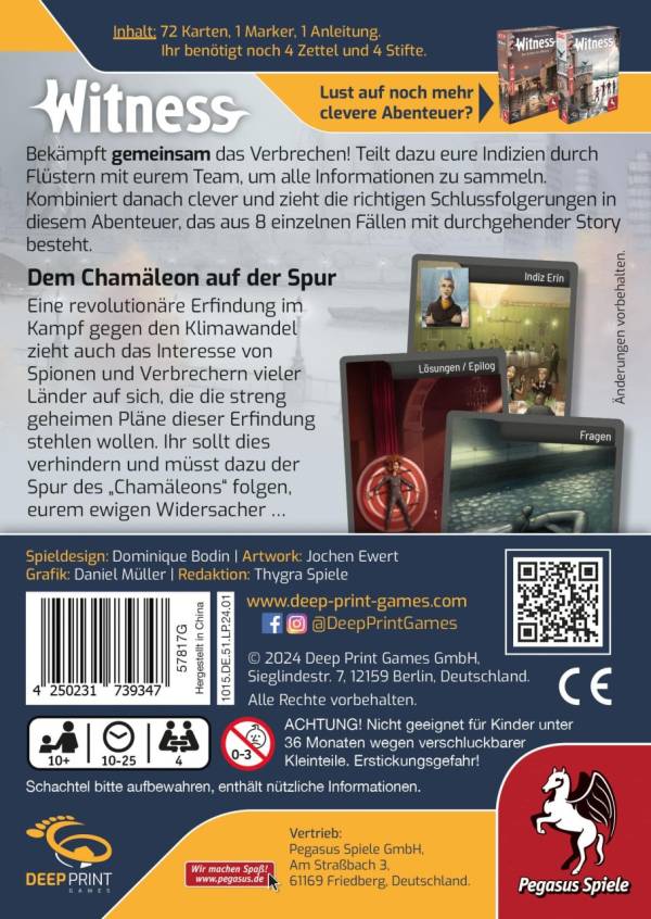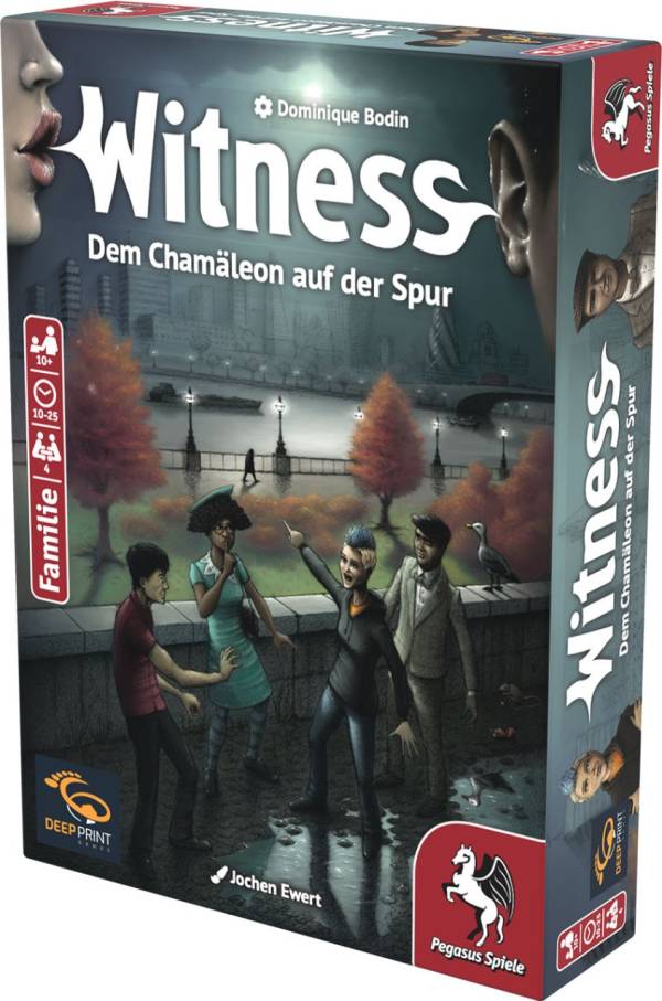 Deep Print Games (2024)In der überarbeiteten Neuauflage von Witness bekämpfen genau vier Personen als Mitglieder der Geheimorganisation „Witness Agency“ gemeinsam das Verbrechen! Ein Prolog führt in den Fall ein, danach erhält jedes Teammitglied eigene, geheime Indizien. In den vier Flüsterrunden werden diese – in Pfeilrichtung der Flüsterkarte – an eine andere Person weitergegeben. In der ersten Runde werden nur die eigenen Indizien weitergeflüstert, ab der nächsten Runde dann auch die, die die Spielenden in der vorherigen Runde erhalten haben. Nach der vierten Flüsterrunde beantworten die Spielenden geheim drei Fragen zum Fall. Wer gut zugehört hat und die Fragen richtig beantwortet hat, bekommt bei der Auflösung wertvolle Punkte.
