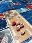 Survey the sizes of shadows on the backs of 9 different fish shoals at three depths, determining what you think you can afford to catch and if you want to risk it for a potentially better reward. Flip fish, spend dice, add them to your collection - but beware of reveal and catch abilities that can have various effects on the game!