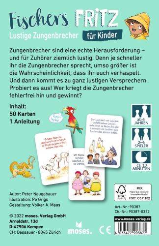 Ähnlich klingende Wörter, schwer auszusprechende Buchstabenkombinationen und wirre Sätze: Zungenbrecher sind eine echte Herausforderung. In "Fischers Fritz" finden sich 50 knifflig-lustige Zungenbrecher zum Vorlesen, Verhaspeln und Lachen. Doch Zungenbrecher machen nicht nur Spaß, sondern fördern ganz spielerisch auch die Sprachfertigkeit, Aussprache und Konzentration bei Kindern ab dem Grundschulalter. Wer kann die meisten Karten fehlerfrei vorlesen und gewinnt das Spiel?