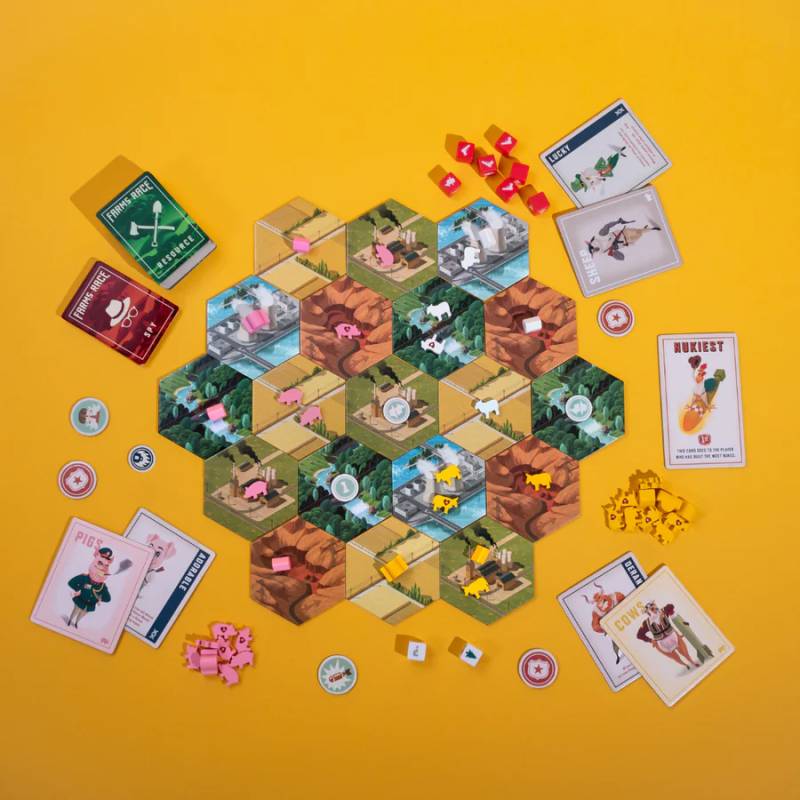 Farms Race LLC dba Medium Brow G (2025)Es reicht jetzt mit diesen beschaulichen Handelsspielen samt ihren kindischen Bauernhoftierchen. Bei Farms Race handelt es sich um ein 1-2-stündiges Strategiespiel, das sich zunächst wie ein Euro-Gesellschaftsspiel anfühlt - bei dem aber mit Atombomben angegriffen wird.