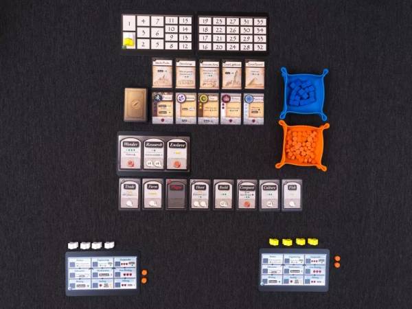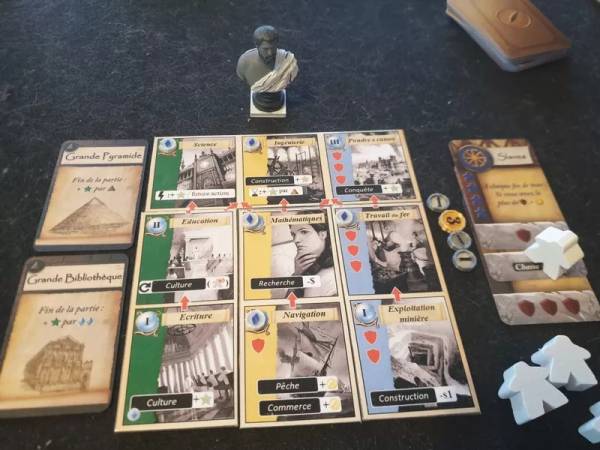 The game is played with 6 rounds. In the 1st round, each player picks one civilization card in the market and gains a number of worker tokens according to the population value indicated on the civilization card. Players may assign workers to action slots in the public region. There are usually 5-6 actions for each player to choose and these actions change between rounds. By assigning workers, players carry out the actions' effects such as earning coins or paying coins for technologies, wonders, or victory points, etc. At the end of a player's turn, workers may return to the player or disappear according to the kind of action it was working on.