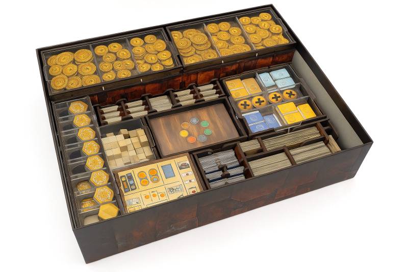 Crafted from durable, high-quality HDF, the insert is sturdy and easy to assemble – no glue needed. It fits perfectly inside the game box and includes dedicated space for premium tokens. Check the photos for a suggested component layout.