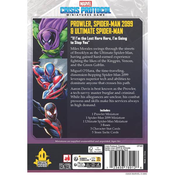 Atomic Mass Games (2025)The character pack Prowler, Spider-Man 2099 & Ultimate Spider-Man for Marvel: Crisis Protocol contains miniatures, Character Stat Cards, and Team Tactic Cards.