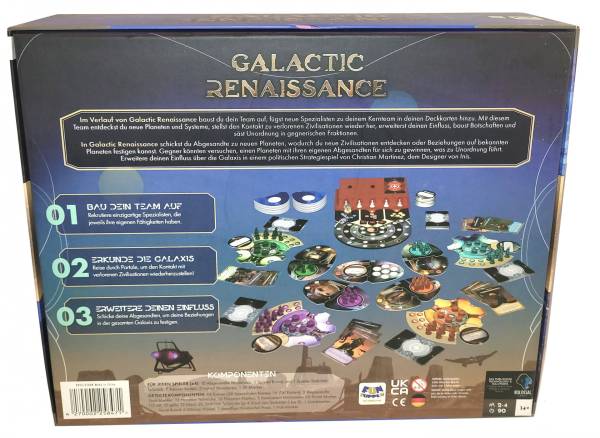 Fun Supply (2025)Fun Supply hat eine deutschen Version des Weltraum-Explorationsspiels Galactic Renaissance auf den europäischen Markt gebracht. Im Anschluss an Inis ist Galactic Renaissance der zweite Teil der „Politischen Trilogie“ von Autor Christian Martinez und Verlag Matagot.