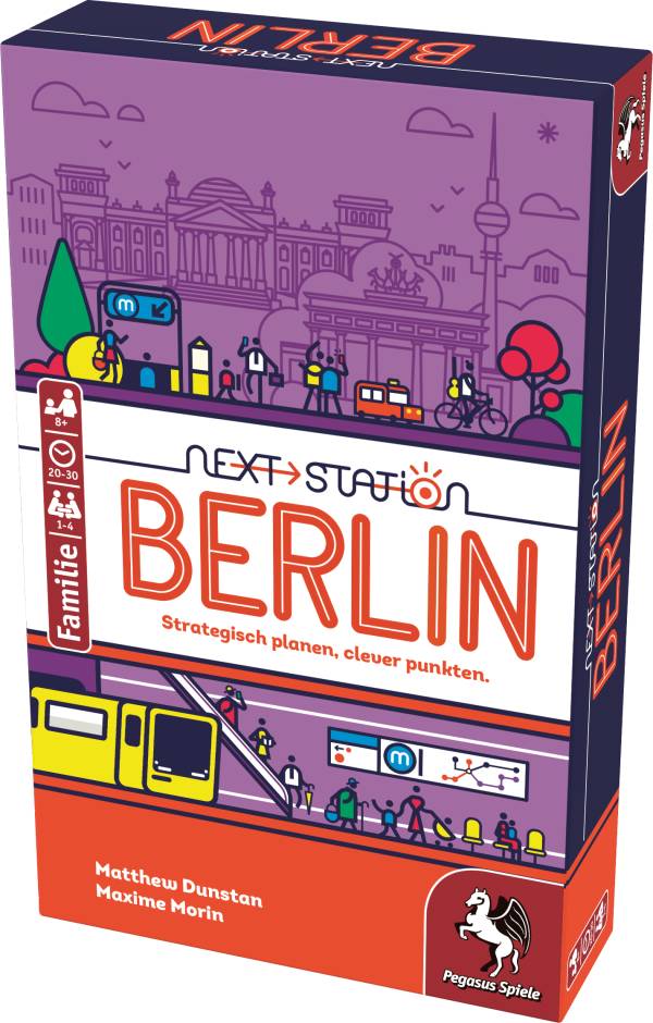 Pegasus Spiele (2026)In Next Station: Berlin wetteifert ihr darum, das effizienteste U-Bahn-Netz der deutschen Hauptstadt zu entwerfen. In vier Runden zeichnet jeder Spieler farbige U-Bahn-Linien auf seine eigene Karte, beginnend mit zwei festgelegten Abfahrtsstationen an gegenüberliegenden Seiten der Stadt. Sobald Stationskarten aufgedeckt werden, verlängern alle Spieler gleichzeitig ihre bestehende Linie zu den entsprechenden Symbolen. Dabei müssen sie die aufgedruckten Verbindungen und die strengen Bauregeln genau beachten: keine Gleiskreuzungen, keine Schleifen und kein Zurückfahren der Strecke.