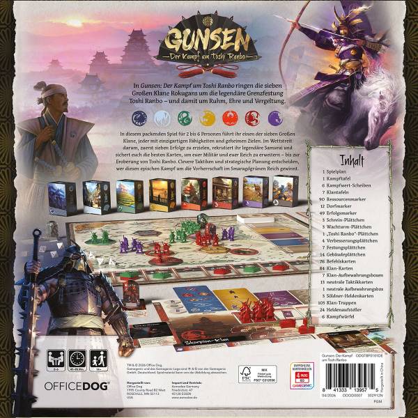 In diesem packenden Kennerspiel führt ihr einen der sieben Großen Klane, jeder mit einzigartigen Fähigkeiten und geheimen Zielen. Im Wettstreit darum, zuerst sieben Erfolge zu erzielen, rekrutiert ihr legendäre Samurai und sichert euch die besten Karten, um euer Militär und euer Reich zu erweitern - bis zur Eroberung von Toshi Ranbo.