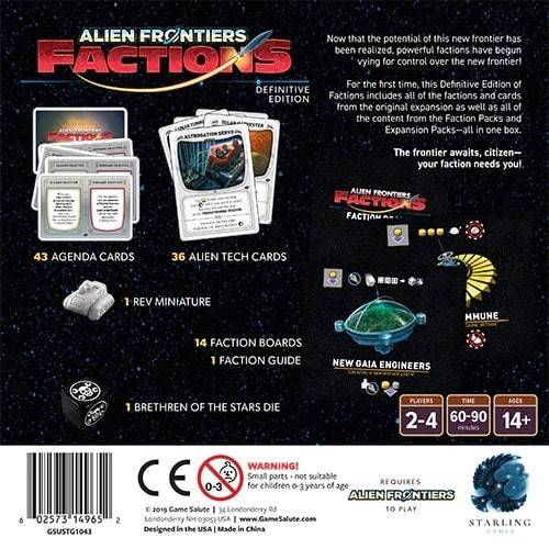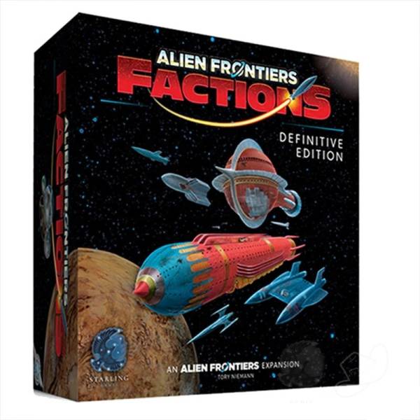 Tabletop Tycoon (2023)Alien Frontiers: Factions expands the award-winning Alien Frontiers core game, including new Alien Tech cards to expand your technological arsenal, new Agenda cards that earn you Victory Points for completing hidden objectives, and individual Faction boards that give their owners an exclusive bonus as well as providing another facility that anyone can use...for a price.