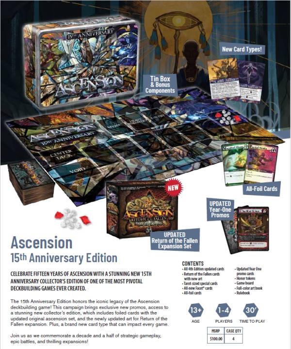 The 15th Anniversary Edition honors the iconic legacy of the Ascension deckbuilding game! This campaign brings exclusive new promos, access to a stunning new collector’s edition, which includes foiled cards with the