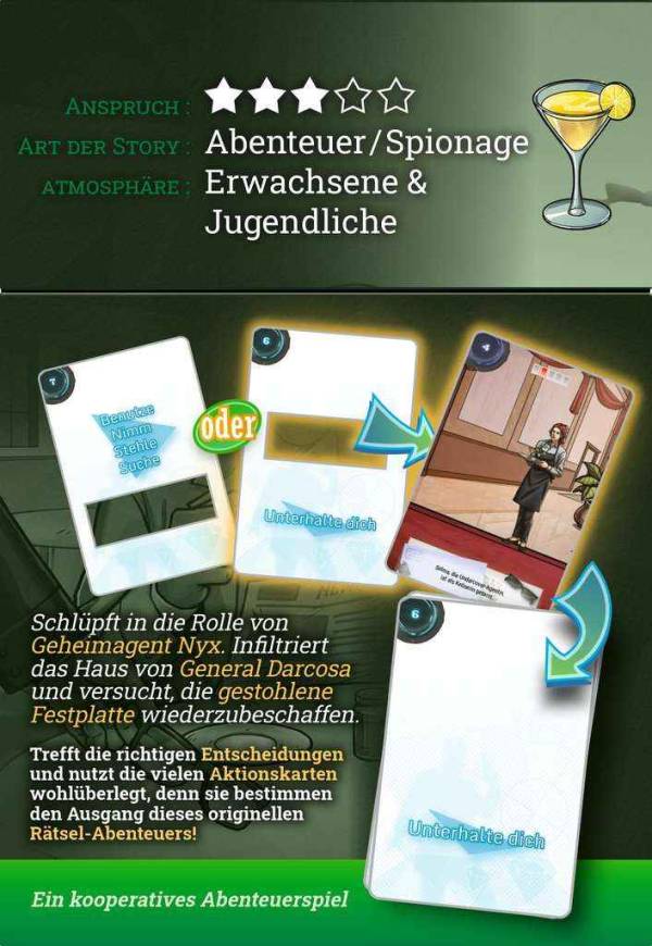 Ihr schlüpft gemeinsam in die Rolle von Agent Nyx und begebt euch auf die Suche nach einer Festplatte mit weltbedrohendem Inhalt. Jede Entscheidung kann weitreichende Folgen haben und den Lauf der Geschichte verändern.