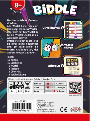 Das Ergebnis ist ein flotter Mix aus Bluff, Würfelglück und taktischem Einschätzen, der in knapp 30 Minuten für reichlich Gelächter sorgt. „Biddle“ ist damit ein Spiel, das zeigt: Wer wagt, gewinnt – aber nur, wenn die Würfel mitspielen.