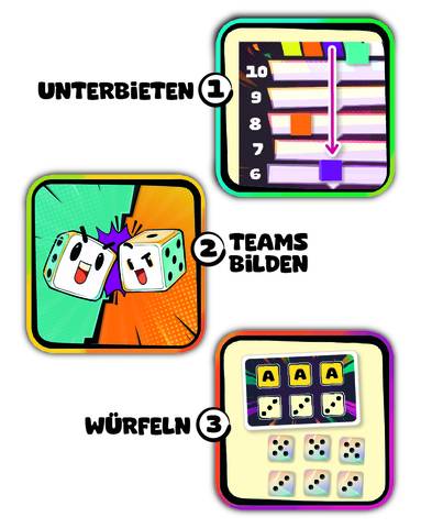 Ein quirliges Würfel-Bietspiel, bei dem man ständig zwischen Größenwahn und Demut schwankt. Der Ablauf ist so simpel wie fies. Auf der Biettafel gibt jeder an, in wie vielen Würfen (zwischen 1 und 10) er glaubt – mit den 6 Würfeln -, die ausliegende Aufgabenkarte (z.B. exakt eine 30 zu erreichen, oder dreimal die 3 und dreimal die 4) zu meistern. Klingt nach Mutprobe – und genau das ist es auch. Wer zu hoch pokert, blamiert sich; wer zu vorsichtig ist, geht leer aus.