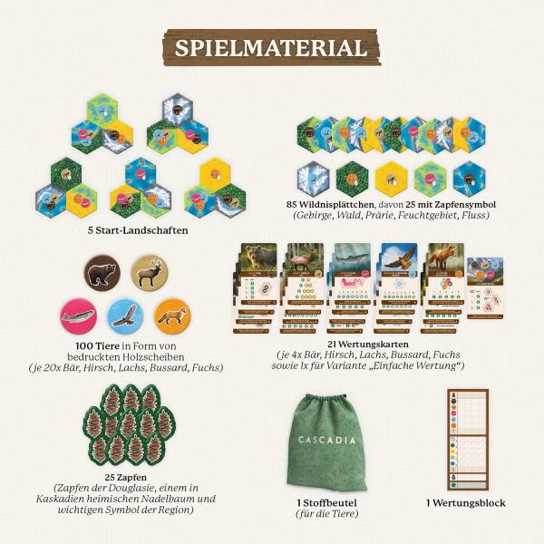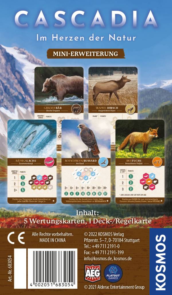 Kosmos (2022)Diese Mini-Erweiterung zum beliebten Brettspiel Cascadia enthält 5 neue Wertungskarten für Grizzlybär, Wapiti-Hirsch, Königslachs, Rotschwanzbussard und Rotfuchs. Die Karten werden dem Grundspiel hinzugefügt, um dadurch die Anzahl möglicher Wertungskarten-Kombinationen zu erhöhen. Für noch mehr Abwechslung und neuen Herausforderungen.