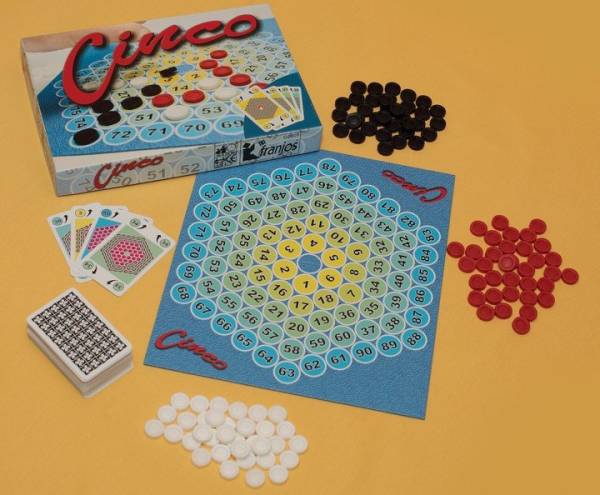 Franjos (2010)Im Spiel CINCO muss jeder eine gerade Reihe aus fünf eigenen Spielsteinen bilden. Die ausgespielten Karten bestimmen dabei, wohin man setzen darf. Je kleiner der Wert ist, umso mehr Möglichkeiten zum Setzen gibt es. Schnell gespielt und immer wieder spannend, das ist CINCO!