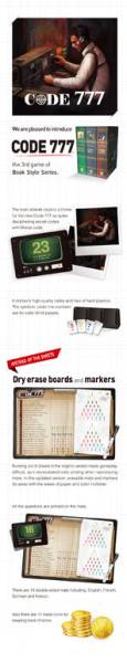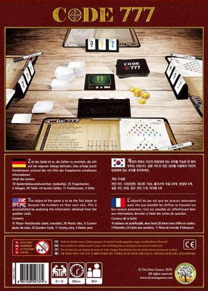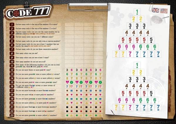 Auf der Code 777-Karte steht ein Diagramm, in dem alle Zahlen, die im Spiel vorkommen, in der entsprechenden Farbe abgebildet sind. Auf dem Notizformular stehen ebenfalls Digramme. Darauf können Zahlen durchgestrichen werden, bezüglich derer ein Spieler kombiniert, dass sie sich bestimmt nicht auf seiner Ablage befinden.