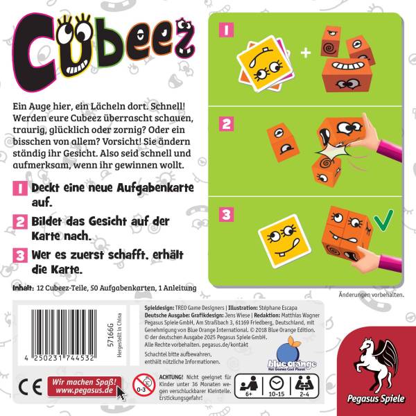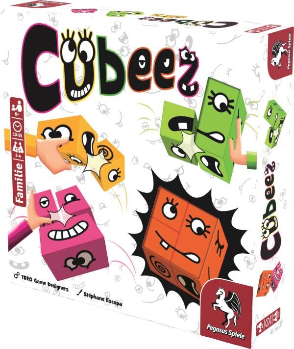 Pegasus Spiele (2026)Ein Auge hier, ein Lächeln dort. Aber lugt da aus dem Mund ein Zahn raus und schaut das Auge nach links oder rechts? In Cubeez müssen die Spielenden genau hinschauen und das aktuell ausliegende Gesicht dann möglichst schnell mit ihren eigenen Cubeez-Würfeln nachbauen. Wer das zuerst schafft, erhält die Karte und es geht sofort mit dem nächsten Gesicht weiter.