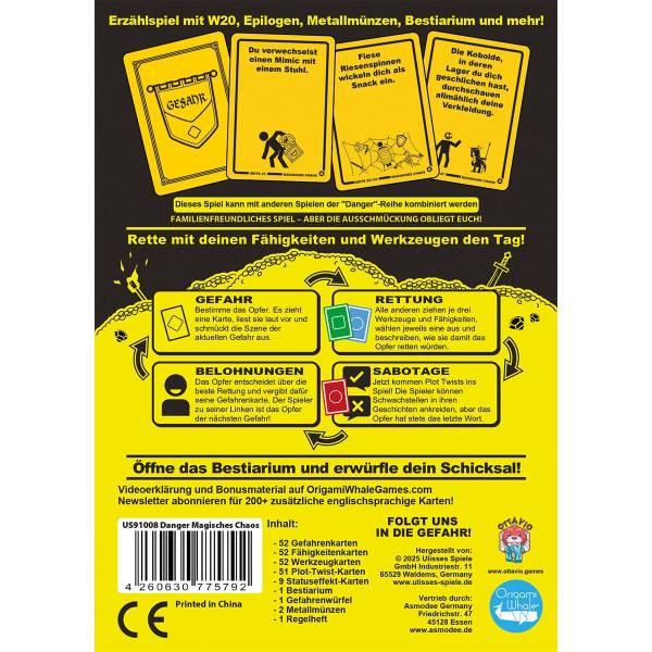 Ottavio (2026)Danger: Magisches Chaos ist ein chaotisches Story-Spiel in dem ihr gemeinsam improvisiert, diskutiert und kreative Rettungsaktionen bewertet. Jedes Mal steht eine Person im Mittelpunkt des Geschehens – und zwar in ernsthaften Schwierigkeiten. Ob magische Fehlzündung, monströse Bedrohung oder uralter Fluch: Die Situation ist brenzlig. Alle anderen müssen nun spontan Ideen entwickeln, wie die Rettung gelingen könnte.
