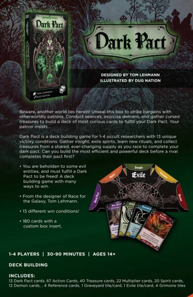 Dark Pact is a deck building game for 1-4 occult researchers with 13 unique victory conditions. Gather insight, exile spirits, learn new rituals, and collect treasures from a shared, ever-changing supply as you race to complete your dark pact. Can you build the most efficient and powerful deck before a rival completes their pact first?