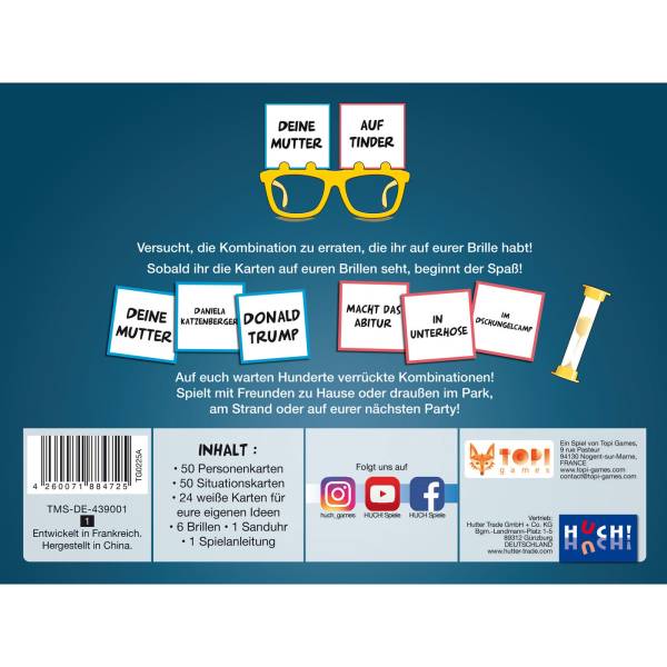 Huch & Friends (2025)Kannst du erraten, wen du auf deiner Brille hast? Ist es Taylor Swift in einem Kloster, Donald Trump beim Oktoberfest oder doch einfach nur deine Mutter in Unterhose? Du darfst nur „Ja/Nein“- Fragen an die anderen stellen und musst so auf die richtige Lösung kommen! Hier warten hunderte lustige Kombinationen auf euch!