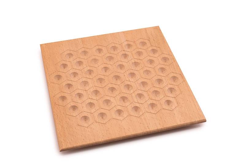 Das Spielfeld besteht aus Sechseck-Feldern, jeweils mit einer Mulde in der Mitte.