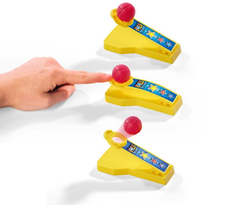 Abwechselnd versucht ihr eure Bälle in die Körbe zu treffen und drei in einer Reihe, waagrecht, senkrecht oder diagonal zu platzieren. Zum Zielen können die beiden enthaltenen Ballschleudern verwendet werden oder ihr werft in die Körbe. Je größer der Abstand beim Werfen, desto schwieriger wird die Partie!