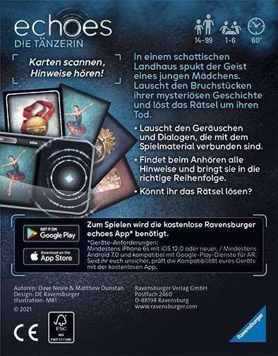 In einem schottischen Landhaus spukt der Geist eines jungen Mädchens. Das Echo der Vergangenheit birgt das Geheimnis ihres Todes. echoes ist ein einzigartiges, kooperatives Audio Mystery Spiel. Die Spieler hören mithilfe der kostenlosen Ravensburger echoes App mysteriöse Geräusche und Stimmen, die mit dem Spielmaterial verbunden sind. Gemeinsam suchen sie nach versteckten Hinweisen in den Geräuschen, um die Geschichte in die richtige Reihenfolge zu bringen und den Fall zu lösen.