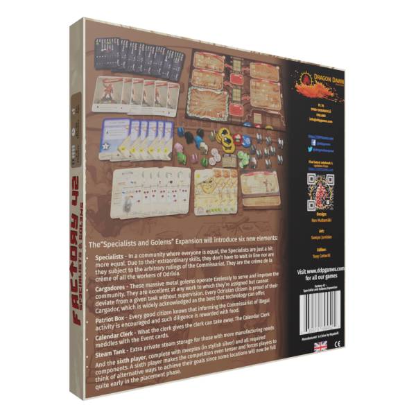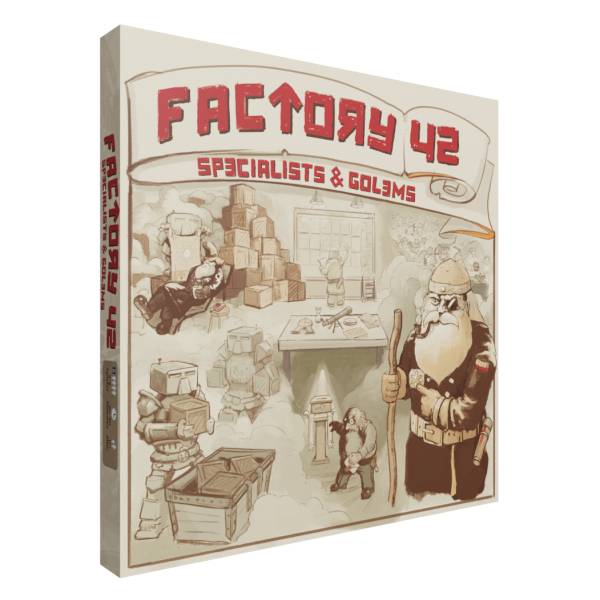 Factory 42 is a highly-acclaimed medium-weight theme-rich worker-placement game. It is well-tested over two print runs and has been found to need very little change, making it a stable platform on which to build. Over the years, our design team has been testing potential additions to the game and now the new "Specialists and Golems” Expansion will introduce five new elements: