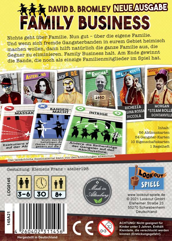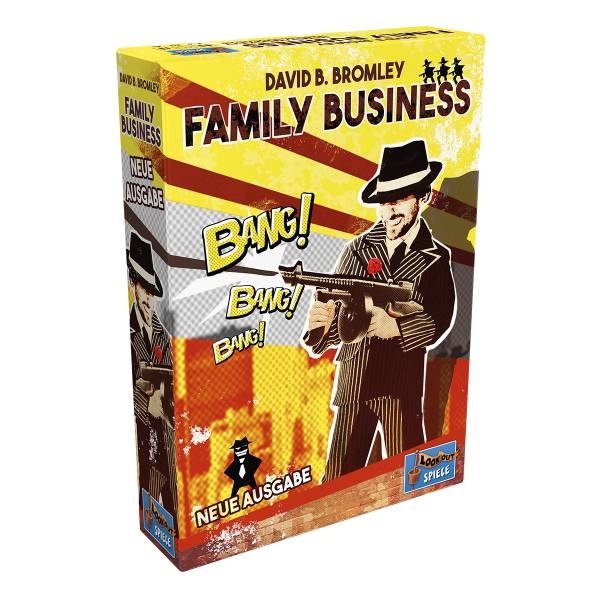 Lookout Spiele (2021)In dieser Neuauflage des flotten Stichspiels Family Business von David B. Bromley müssen die Spieler ihre Karten gut ausspielen. Zu Beginn wählen alle Spieler eine Mafiafamilie und die dazugehörigen Karten aus. Als Gangsterbosse des eigenen Familienunternehmens gilt es, die Kontrolle über die Stadt zu erlangen. Um das zu erreichen, müssen alle Mitglieder der anderen Familien in der Stadt verdrängt werden. Ob Mordaufträge, Razzien, Intrigen, Hinterhalt oder Bandenkrieg - dazu ist den Spielern jedes Mittel recht. Wer am Ende der Partie noch Ganoven übrig hat, kann die Stadt regieren und sich von nun an Big Boss nennen.