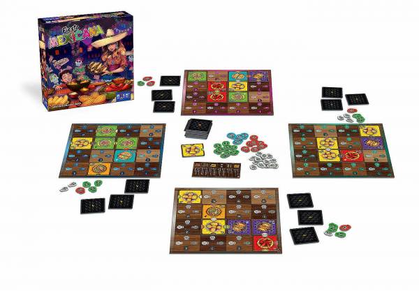 Huch & Friends (2020)Isabella und Miguel feiern ein großes Familienfest zu Ehren der Toten und ihr wollt ihnen helfen. Doch die vielen Gäste und verschiedenen Gerichte fordern euch ganz schön heraus! Jeder von euch ist für einen Tisch zuständig und versucht, die Wünsche der Gäste zu erfüllen. Reihum bietet ihr für die Speisen - doch aufgepasst: Die freien Zahlen auf euren Tischen bestimmen gleichzeitig eure Gebote und die Plätze, auf die ihr die Gerichte legen könnt! Wer leer ausgeht, darf seinen Tisch um 90° drehen - und bekommt so wieder neue Zahlen zum Bieten!