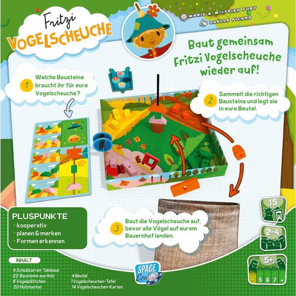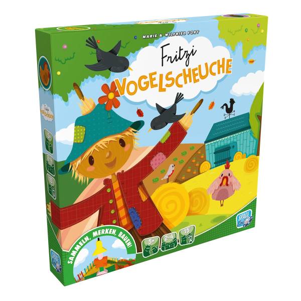 Die Karten auf der Vogelscheuchen-Tafel zeigen euch, aus welchen Bausteinen die Vogelscheuche besteht und in welcher Reihenfolge sie gestapelt werden müssen. Das müsst ihr im Auge behalten und euch merken, welche Bausteine in euren Beutel gewandert sind, um sie zum richtigen Zeitpunkt herauszuziehen. Nehmt euch dabei in Acht vor den Vögeln, die das Spiel schneller beenden können, als euch lieb ist. Schafft ihr es, Fritzi rechtzeitig wieder aufzurichten?