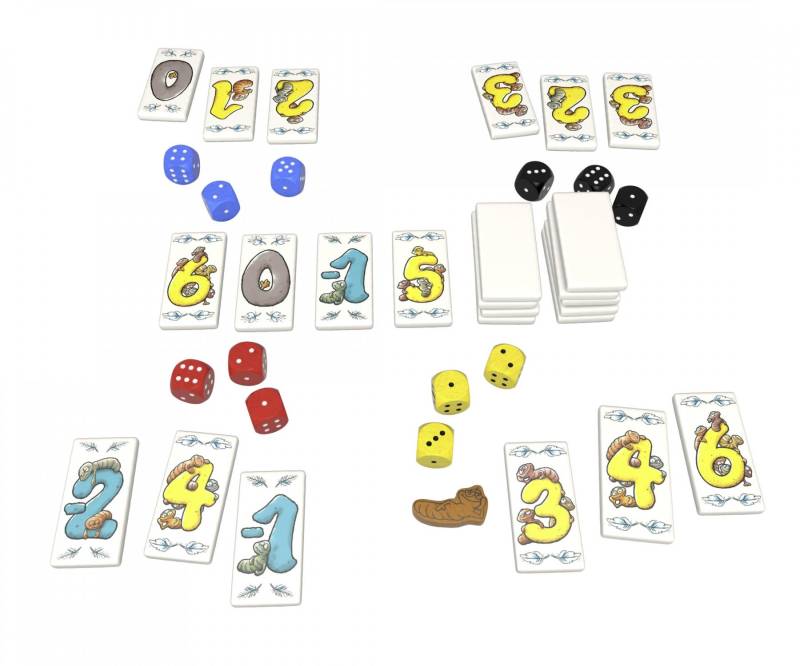 Just 3 dice per player are enough to create a big cackle on the chicken menu board. At the start of each game round, a worm snack is laid out on the buffet for each player - in different sizes and flavours. According to the familiar Gigi Gacker game principle, the biggest - and now ‘strongest’ - chicken always grabs the first morsel on the buffet - even if it is not the tastiest. In the dice rounds, all the ‘tactical tricks’ are used to fight for the biggest morsels. Less tasty worms themselves can be used as ‘dice substitutes’ or simply ‘added’ to the neighbouring plates. It is also very popular to reverse the order of the courses on the buffet until the competition is at the very back. Apart from that, some starters are extremely inedible and carry minus points …