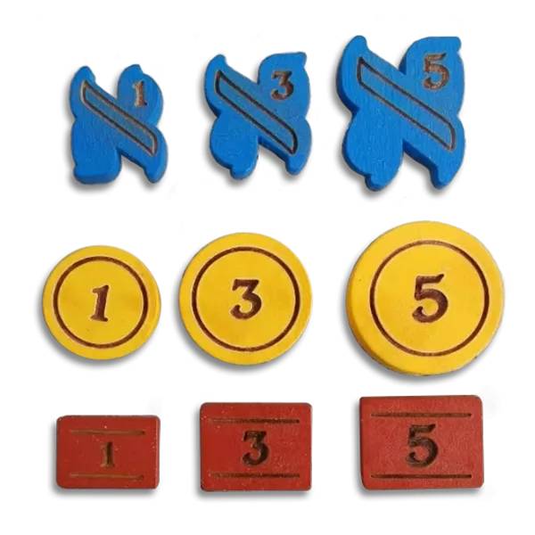 Cranio Creations (2023)Wooden set of Clay, Knowledge and Coin tokens.