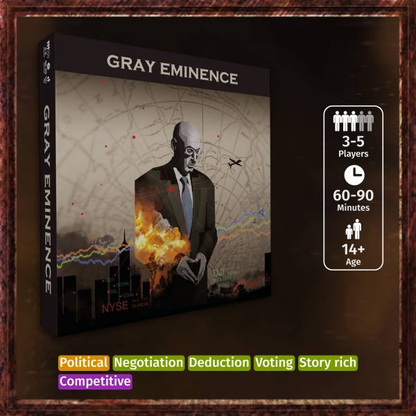 Gray Eminence ist ein Spiel für 3-6 Spieler, das in der modernen politischen Arena spielt und zwischen 60-90 Minuten dauert. Geheime, schattenhafte Gestalten, die im Verborgenen agieren, nutzen Geld, Macht und Einfluss, um den Kurs mehrerer Fraktionen wie Stiftungen und großer Unternehmen in Richtung ihrer eigenen undurchschaubaren Ziele zu lenken. Innerhalb dieser Parameter schlüpfen die Spieler in die Rollen dieser mächtigen Puppenspieler, von denen jeder sowohl auf gemeinsame Ziele als auch auf seine eigene, geheime Agenda hinarbeitet.