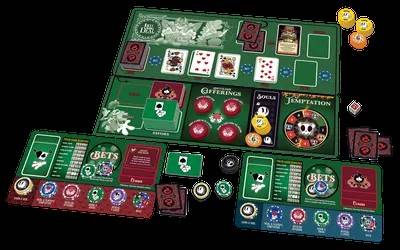 It's a Texas Hold'em style game - and players get not two but three cards dealt to them (one up their sleeve for more options). You may earn powerful Favor cards that let you cheat, like making a four-card Flush, but at the cost of a Curse or suffering Temptation.