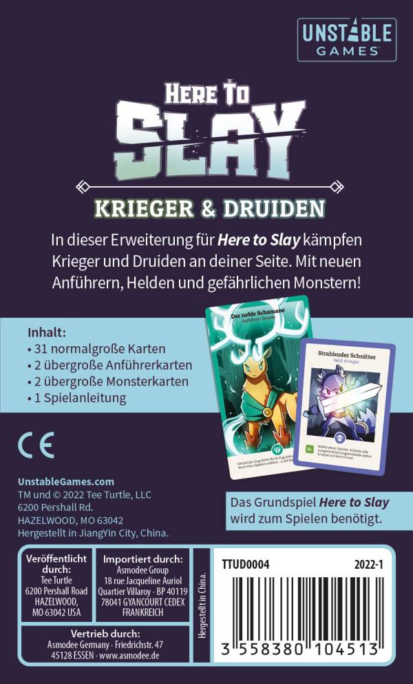 Unstable Games (2022)In dieser Erweiterung für das kompetitive Kartenspiel Here to Slay kämpfen Tiere aus den beiden neuen Klassen Krieger & Druiden an der Seite der Spieler. Mit neuen Anführern und Helden können sie ihr perfektes Team zusammenstellen, um gegen noch gefährlichere Monster anzutreten und die Sabotageversuche ihrer Widersacher zu vereiteln.