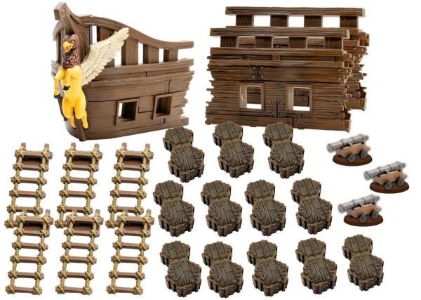 Features: Battered ship remains bring new opportunities, and new dangers, to the battlefield. Build dramatic coastal skirmishes or scatter the wreckage across any battlefield for added flavor and tactics. Cannons, rope ladders, and shattered ship walls offer cover, objectives, and strategic points for your army to exploit.