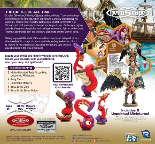 This expansion includes 1 Unique Hero, a 5-figure Unique Squad, and instructions for a 2 or 3-player Boss Battle Scenario. The highly detailed, pre-assembled miniatures and 3 Army Cards are fully compatible with all Heroscape Battle Boxes, Master Sets, and Expansions. Command the cunning Valkyrie-turned-pirate Thormun and his monstrous ally, the legendary Kraken! Thormun rallies disillusioned warriors with strategic Command Markers, while the Kraken strikes from beyond the battlefield, its many tentacles dragging enemies to their doom.