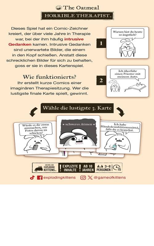 Dieses Spiel hat der Comic-Zeichner The Oatmeal kreiert, der über viele Jahre in Therapie war, bei der ihm häufig intrusive Gedanken kamen. Intrusive Gedanken sind unerwartete Bilder, die einem in den Kopf schießen. Anstatt diese schrecklich makaberen und witzigen Bilder für sich zu behalten, goss er sie in dieses Kartenspiel ...