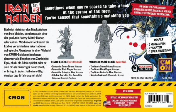 CMON (2023)Eddie ist nicht nur als Maskottchen von Iron Maiden bekannt, sondern auch eine der größten Heavy-Metal-Ikonen aller Zeiten. Mit diesem Set können Spieler Eddies verschiedene Inkarnationen auf epische Abenteuer in einer Vielzahl von CMON-Spielen mitnehmen. Der Iron Maiden Character Pack 3 enthält zwei große Miniaturen und sogar das Material für deutsche und englische Versionen der Spiele.