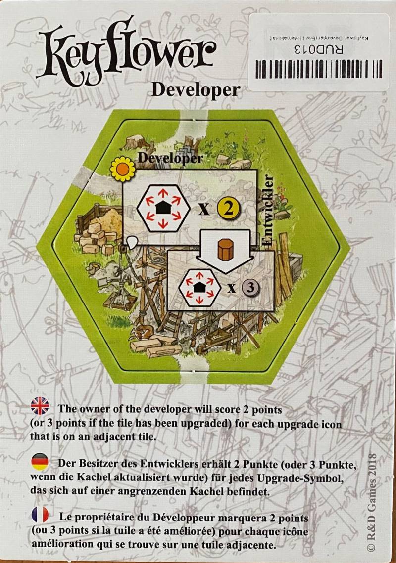 Le propriétaire du Développeur marquera 2 points (ou 3 points si la tuile aété améliorée) pour chaque icône amélioration qui se trouve sur une tuile adjacente.