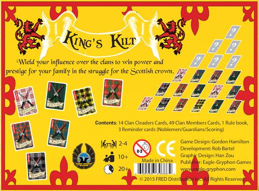Eagle-Gryphon Games In King's Kilt players wield their influence over the clans to win power and prestige for the family in the struggle for the Scottish crown. Players start with 3 hidden Clan Members that represent their candidates to promote to the throne, and throughout the game players vie to place their candidates within the hierarchy of clan members in their quest to ascend the throne. Treachery can also be used to eliminate opponents in their way. At the end of the game, if the player's candidates match the clan of the King, Guardians, or Nobles, they will score victory points and gain the seat of power in Scotland!