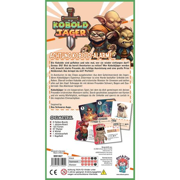 Ottavio (2025)Koboldjäger ist ein kooperatives Abenteuerbrettspiel für 2–4 Personen, das euch in die Fußstapfen eines legendären Koboldjägers treten lässt. Gemeinsam stellt ihr euch mit Würfeln, Zaubern, Spezialkarten und Teamgeist fiesen Monstern, geheimnisvollen Piratenschätzen und mysteriösen Schauplätzen.
