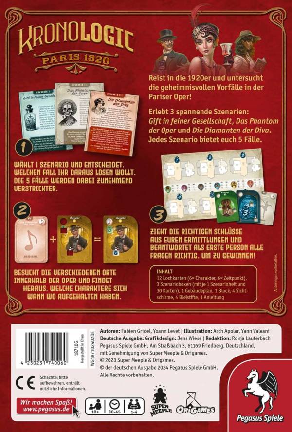 Kronologic – Paris 1920 ist ein Deduktionsspiel mit drei Szenarien, die je fünf Fälle mit steigender Komplexität enthalten.