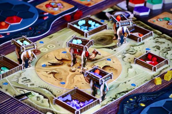 Each turn, a player may perform up to 2 actions, each of which costs a certain amount of water. Players can either move their camel across the board, dig up gemstones, unload collected gemstones, or reserve a jewelry card for later. Players place unloaded gemstones on their own personal rotating workbench, where they try to make the correct patterns - and thereby craft the most valuable jewelry. When the active player has created the pattern displayed on the jewellery card, they can craft it, trading in the gemstones in exchange for taking the card and earning points.Â