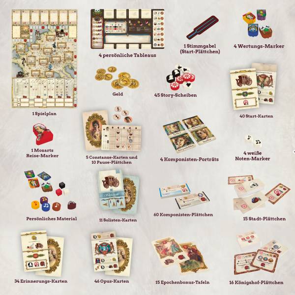 (1 Bewertung. Jetzt bewerten!)Es ist das Jahr 1791: Wolfgang Amadeus Mozart ist tot! Sein letztes Werk bleibt unvollendet. Ein bis vier Spielerinnen und Spieler schlüpfen in die Rolle der Mäzene Mozarts, um das Requiem zu einem Abschluss zu bringen. Dafür heuern sie in diesem Strategiespiel die begabtesten Komponisten ihrer Zeit an, verwalten Mozarts Werke und erinnern sich an die Höhepunkte seines Lebens und Schaffens. Wem gelingt es, als wichtiger Mäzen selbst in die Musikgeschichte einzugehen? Ein abwechslungsreiches und stimmungsvolles Kennerspiel.