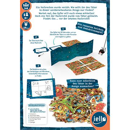 iello (2021)Ihr verpasst den Täter um Haaresbreite am Tatort! Alles, was ihr vorfindet, ist das Opfer und seine letzte Nachricht - eine Zeichnung, die euch Hinweise zum Täter gibt! Aber er konnte seine Spuren noch ein wenig verwischen und macht euch das Leben schwer. Könnt ihr die Hinweise richtig deuten und in einer wuseligen Menschentraube den Täter finden? In Last Message sitzen sich Opfer, Täter und Ermittler am Tisch gegenu?ber. Das Opfer gibt den Ermittlern Hinweise in Form von Zeichnungen, die der Täter noch beeinflussen darf, bevor sie den Ermittlern ausgehändigt wird. Kombiniert geschickt, fu?gt die einzelnen Zeichnungen zusammen und entlarvt den Täter in diesem spannenden Familienspiel