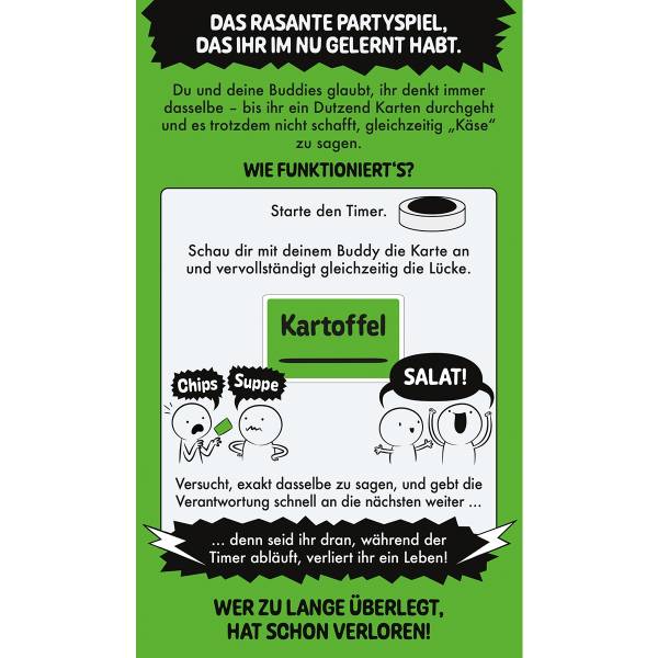 Startet den Timer, der zufällig zwischen 20 und 75 Sekunden läuft. Schau dir mit deinem Buddy die Karte an und vervollständigt gleichzeitig die Lücke. Versucht, exakt dasselbe zu sagen, und gebt die Verantwortung schnell an die nächsten weiter. Denn steht der Kartenhalter noch vor euch, wenn der Timer abläuft, verliert ihr beide ein Leben!