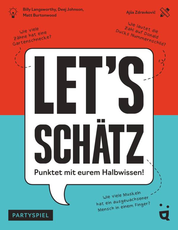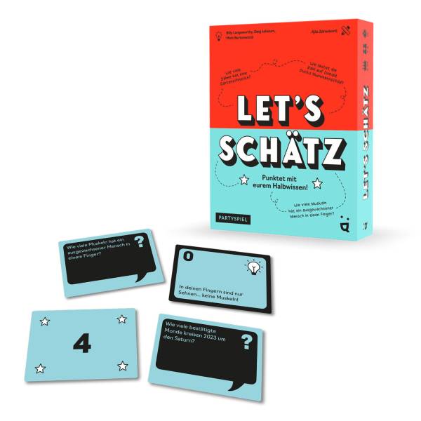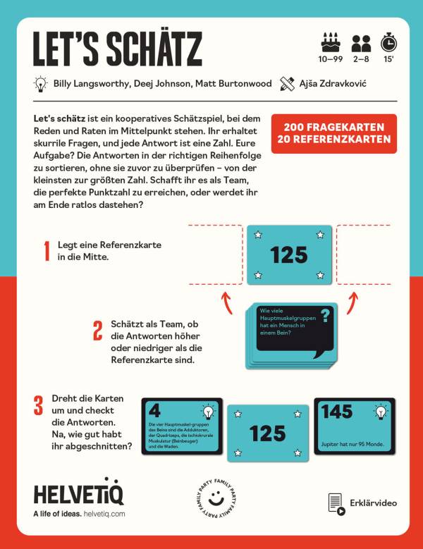 Helvetiq (2025)Erlebt die skurrile Ratewelt von Let‘s Schätz, wo jede Zahl eine Antwort ist und ihr sie gemeinsam von klein nach groß sortiert – und dabei hitzig miteinander diskutiert, was eine erfrischende Abwechslung zu traditionellen Trivia-Spielen bietet. Let‘s Schätz ist ein unglaublich witziges Kommunikationsspiel, bei dem Reden und Raten im Mittelpunkt stehen.